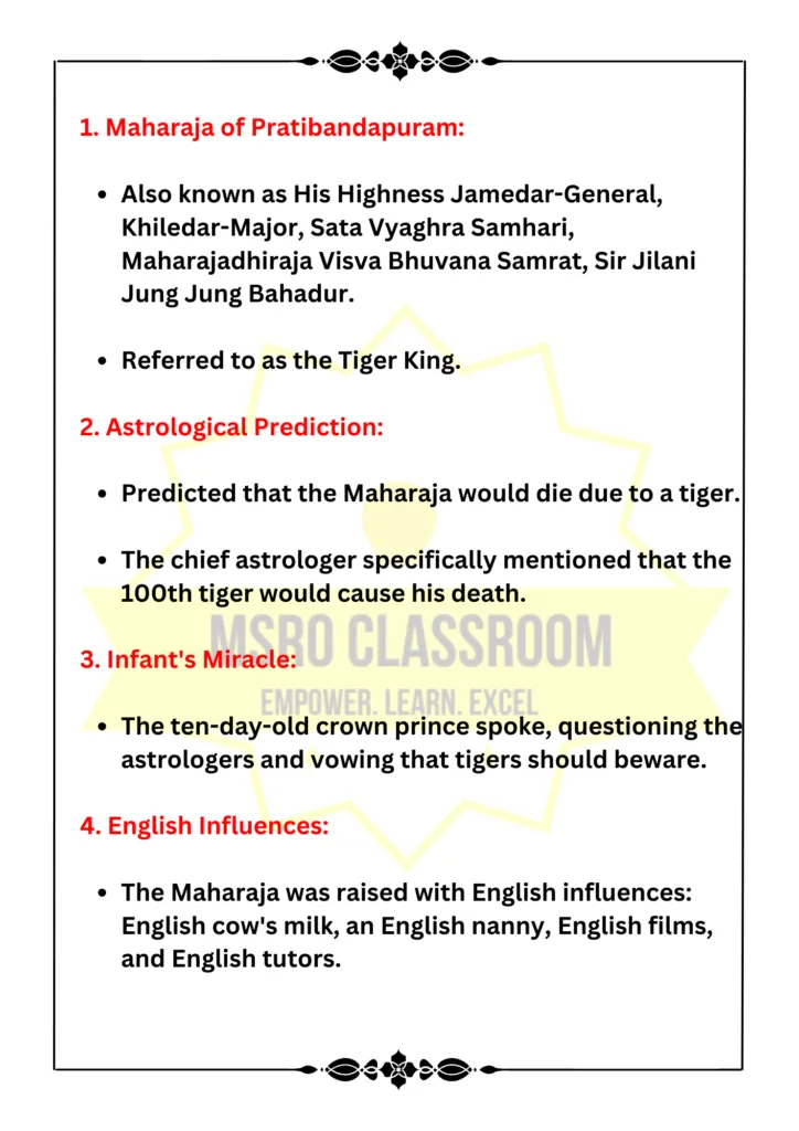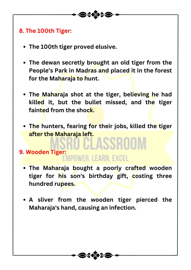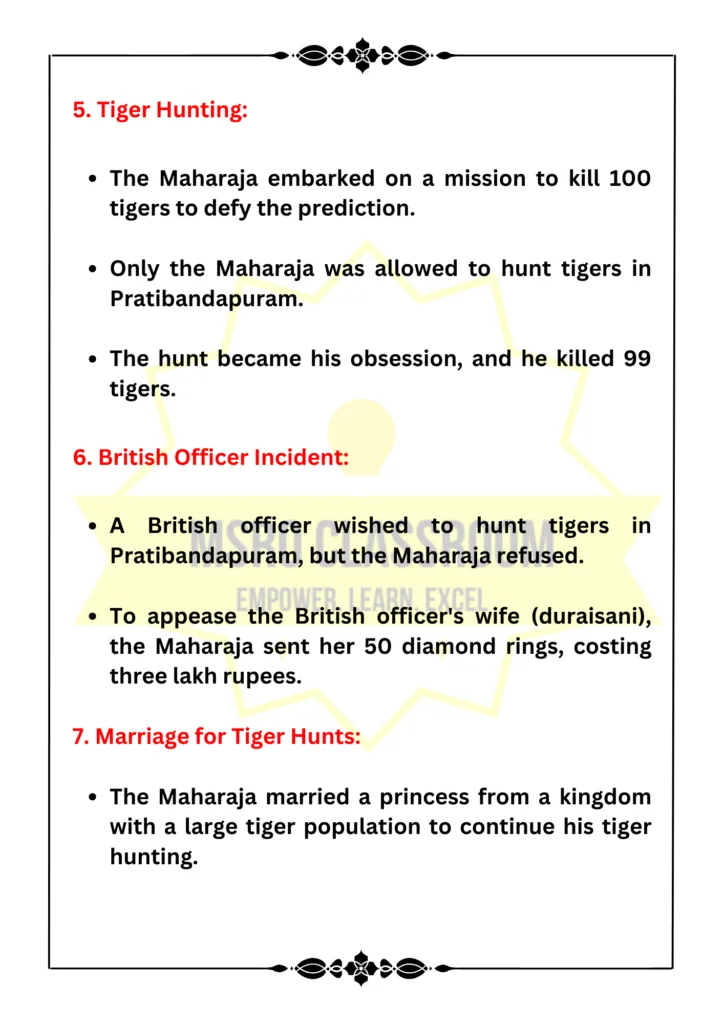 A6: He cleverly sent extravagant gifts to the British officer’s wife, distracting him from the tiger hunt. Although it cost him financially, the Maharaja retained his kingdom’s sovereignty.