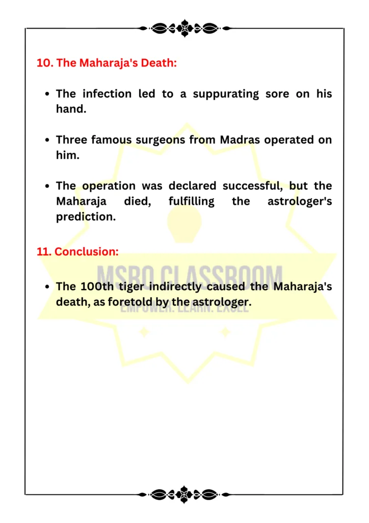 • Tragic Fate: Despite his efforts to avoid his predicted fate, the Maharaja ultimately meets his demise in a tragically ironic manner when he contracts a fatal infection from a wooden tiger toy meant for his son.